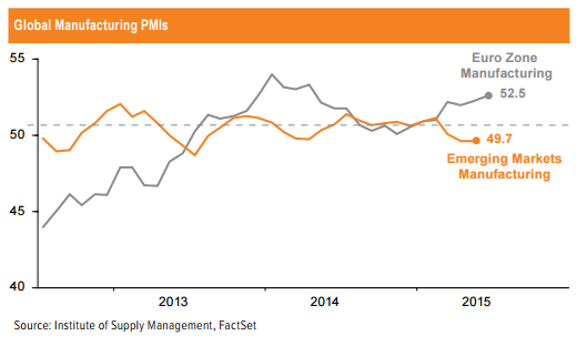 Developed markets have demonstrated awe-inspiring resilience in the face of struggles in China, Brazil, Puerto Rico and Greece. The U.S. economy and markets continue to march forward at a measured pace. The housing sector in particular is showing vigorous improvement, with existing home sales the fastest in eight years and rising to the highest median price on record. The employment front is also looking healthy; jobless claims have fallen to the lowest number since November 1973 and consistently have been below 300,000 since March. The latest U.S. and euro manufacturing reports indicate expansion while emerging markets are contracting slightly.