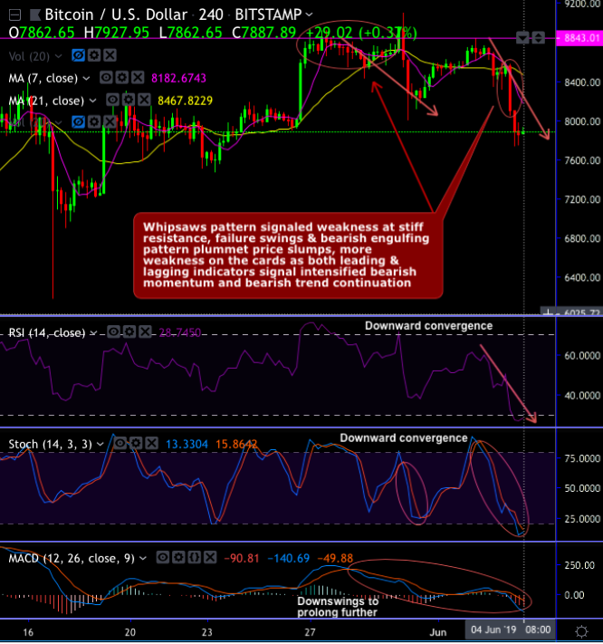 Whipsaws pattern, at the stiff resistance of $8,843 levels, signaled weakness, consequently, the failure swings were observed. As a result, the bearish engulfing pattern has occurred at 8,103.64 level to plummet prices way below DMAs. More weakness seems to be on the cards as both leading & lagging indicators signal intensified bearish momentum and bearish trend continuation. For now, it is trading sideways and exhibiting little to no drive for an upward push.