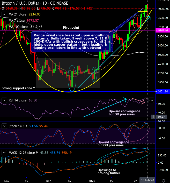 Bitcoin’s bullish streaks have momentarily halted at $10,199 levels, and currently flirting with price band between $9,736 - $10k range. It was explicitly traced our bullish indications during the formation of saucer pattern on daily plotting of BTCUSD and even before that recommendations of long build-ups have been given on December 2nd. Ever since then, it’s been 53% price jump so far and more than 35% in 2020. The pair rallied from $6430 (Dec. lows, that is when we recommended fresh long build-ups) to recent highs of $9,857 level.