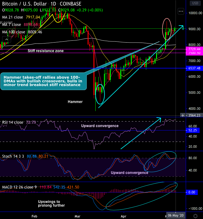 While on a broader perspective, the pioneer crypto has risen above 100-EMAs and retraced 23.6% Fibonacci levels of the Dec’2018 lows and all-time highs in Dec’2017 (refer 2nd chart). Please be noted that since mid-March, BTC has spiked from $3,858 to the current $9,306 which is 140% rallies. And, from April'16, the BTC has spiked from $414 to the all-time highs of $19k, currently, trading decisively at $7.5k levels, which is still a mammoth 1,660% rallies.
