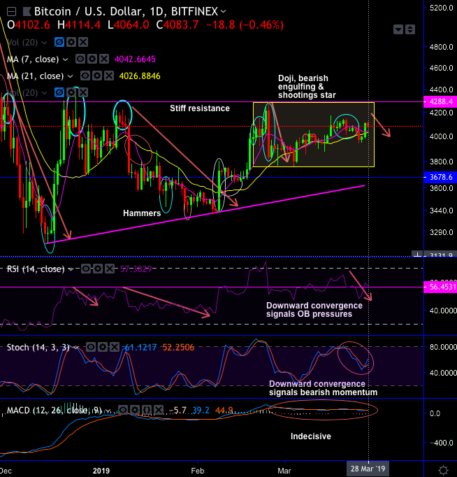BTCUSD has been oscillating between a tight range of $4,282 - $3,761 levels from the last couple of days.