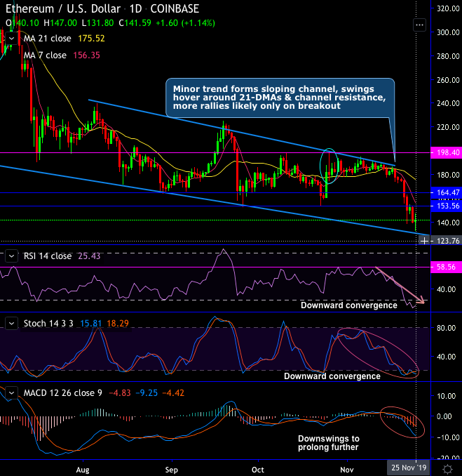 ETHUSD (at Coinbase) minor trend travels through sloping channel, the prevailing price slumps slide the current trend below DMAs upon sharp shooting star candle at channel resistance (at 180.03 levels to be precise), since then the bears have held firmly and finally managed nudge below DMAs (refer daily chart).