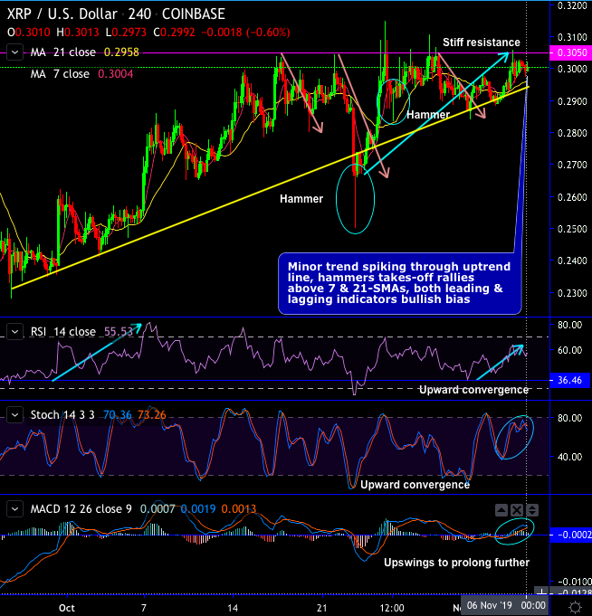 XRPUSD (at Coinbase) minor trend has been spiking through uptrend line (refer daily plotting), while hammer candles 0.2679 and 0.2930 levels.