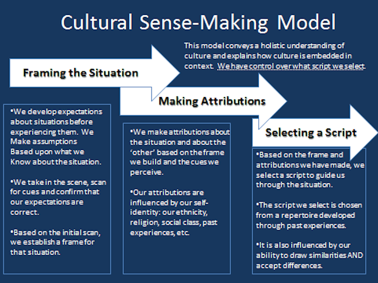 A second technique that can help students decode the invisible factors in critical incidents is the [cultural sense-making model[https://www.jstor.org/stable/4165609?seq=1#page_scan_tab_contents)] developed by Osland and Bird. Using the model’s three step process – framing, making attributions, selecting a script – students can challenge their own assumptions, as well as the people in the story. When the neighbour saw the man in the yard, what frame was in use? What beliefs and stereotypes were being confirmed? How did that person’s schema (mental patterns that stem from an individual’s background, experiences, or attitudes) fuel the attributions being made? What then was the script that led to the actions taken? By asking themselves such questions during activities like these, students not only assess their own biases and recurrent scripts, but may also start re-writing and adopting new scripts about the others with whom they come in contact.