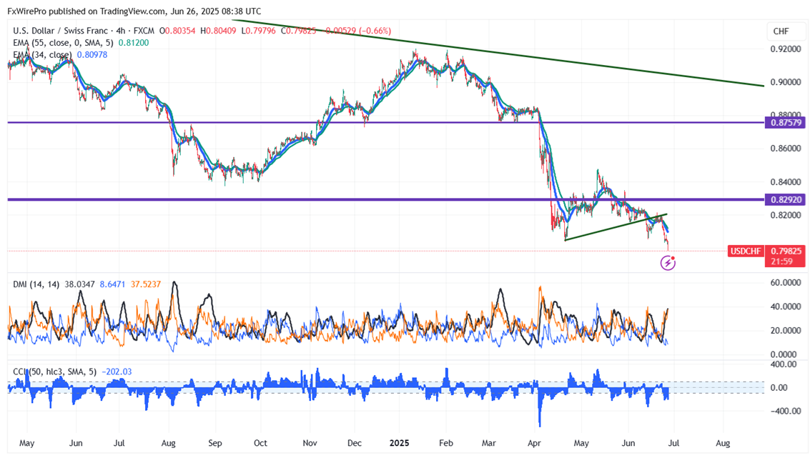 The pair is trading below the 55-EMA, 200 EMA and 365 EMA on the 4-hour chart indicates a bearish trend. The immediate resistance is at 0.8050 any break above targets 0.8090/0.8140/0.8180/0.8250/0.8300.