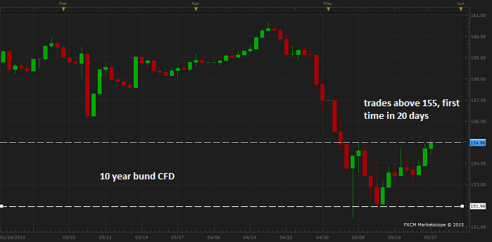 10 year bund CFD, for first time traded above 155 range high in last 20 days. Bund 10 year yield is now trading at range low of 0.52% and German Yield curve have now shifted lower, with 5 year now hovering very close to negative rates.