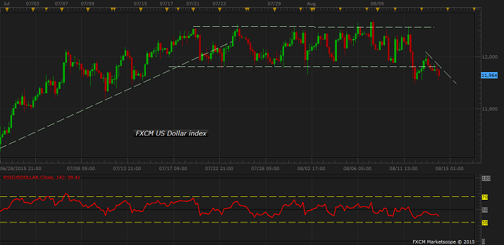 FXCM Dollar index has broken below its recent range of 11980-12060, which had been in place since 21st July, 2015. Moreover, Dollar's attempt to crawl back into the range post break yesterday has soured with price firmly trading below the range as of now.