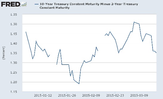 - The chart is prepared in FRED dash board of St. Louis FED. Yield difference between 10 year and 2 year treasury fell to 1.29% compared to 1.51% reached in early March.