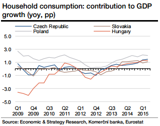 "Domestic demand has now become the key driver of GDP growth, particularly in Poland, Czech Republic and Slovakia, while net exports are tending to reduce growth or support it just marginally (in Q2 15 net exports contributed 0.1pp yoy to GDP growth in Poland and 0.3pp yoy in the Czech Republic). A different situation can be seen in Hungary, where net exports continue to play an important role in the country's economic performance (in Q2 15 net exports ontributed 1.5pp yoy to growth)", notes Societe Generale.
