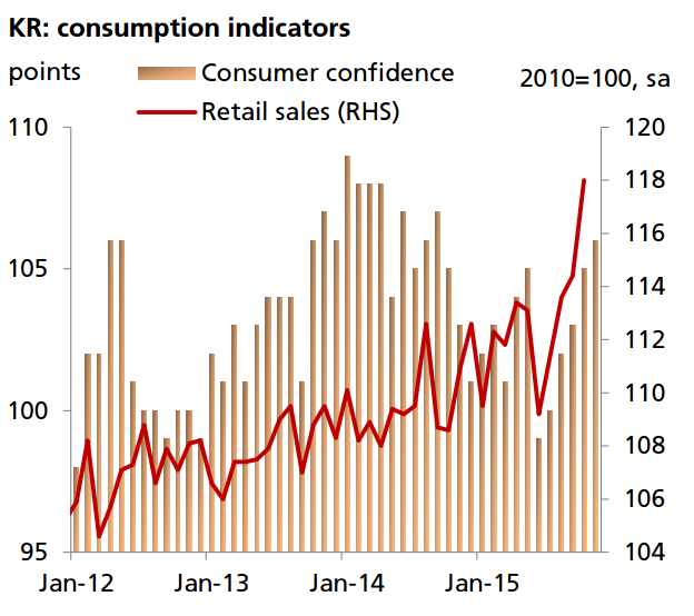 South Korea's domestic demand is gathering pace thanks to the stimulus effects of monetary and fiscal policy easing. Retail sales registered a very strong rise of 3.1% (MoM sa) in Oct. Consumer confidence index picked up for the fifth consecutive month in Nov, staying firmly above the neutral level of 100.