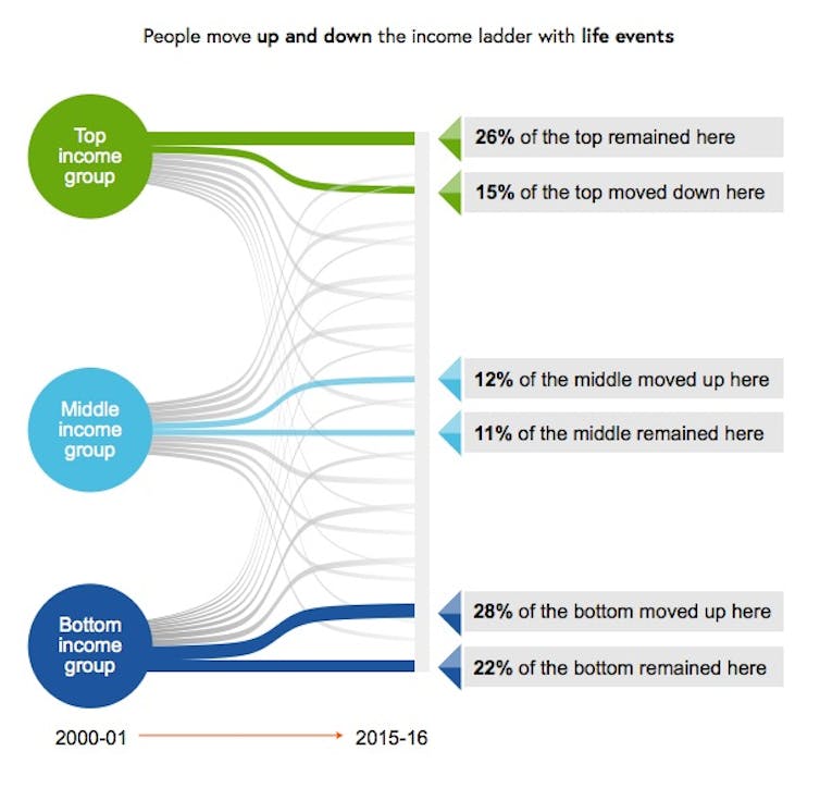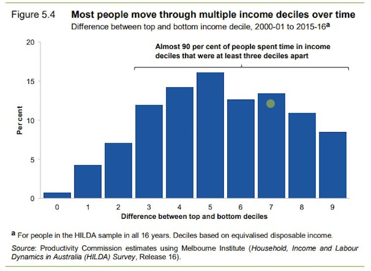 Put simply, not everyone – in fact very few (about 1%) – stay in exactly the same place. Table 5.1 (page 96) shows more than 40% of the Australian population were in a lower income group in 2016 than they had been in 2001, for reasons ranging from retirement to disability to unemployment to family breakdown.
