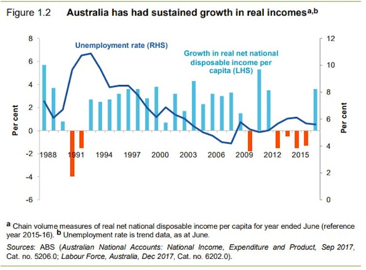 We often hear about Australia as a “miracle economy” enjoying 27 years of economic growth. In fact, the Commission report (Figure 1.2 page 13) shows real net national disposable income per person – a better measure of individual economic well-being than GDP – actually fell in six out of the last 27 years.