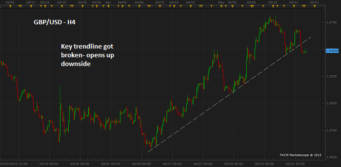 Pound has broken below its key trend line support. Thursday pound moved higher after positive retail sales number taking support from the trend line. However on Friday, stronger than expected core CPI data from US and relatively hawkish Speech led pound lower and broke the key trend line.