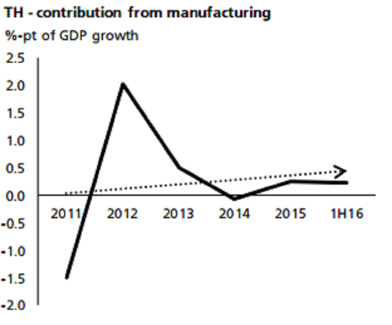 Downside risks continue to hover around Thailand’s gross domestic product (GDP) growth following the drag on the country’s manufacturing sector. While it accounts for almost 30 percent of GDP, contribution from manufacturing came in a mere 0.25 percentage point in 1H16. That is equivalent to slightly over 7 percent of overall GDP growth.