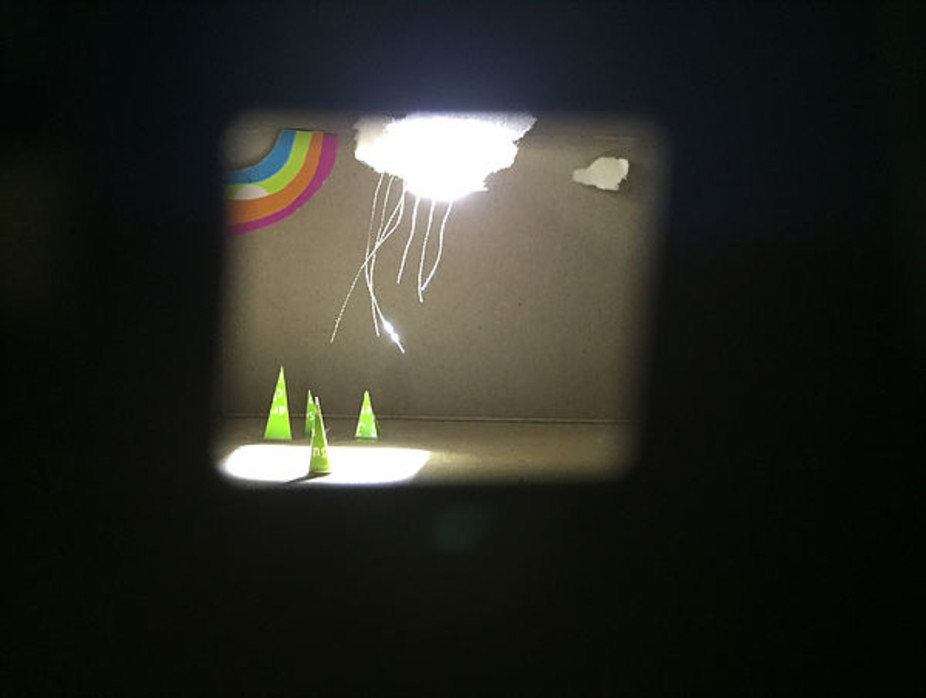 The Imaginary Architecture installation was mounted in the dim downstairs of the Arts Centre, in a space that is as much theatre as foyer, and from the outside it looked like a pile of cardboard boxes. At intervals, mysterious sounds would emerge from within, and coloured lights would flicker and flash.