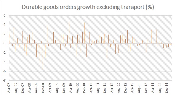 - After solid growth in 2014, goods orders growth excluding transport has fallen to negative territory since October 2014. In March, though durable goods orders grew at 4%, orders excluding transport was in negative territory. (-0.2%).