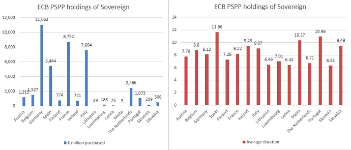 Purchase by country is shown in the figure under PSPP program along with average maturity/duration. A table is presented below for reference.