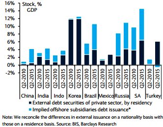 "EM vulnerabilities are likely to become a point of interest for markets once again. Spill-overs from China add to the underperformance of manufacturing- vs. services-driven economies and calls for fundamental weakening in EM FX relative to the USD", says Barclays.