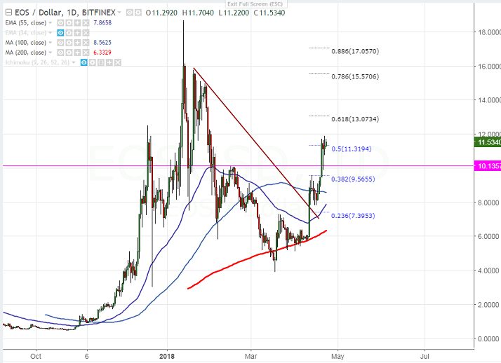 - EOS/USD has jumped more than 50% in previous week after hitting low of 7.80 level. The pair has broken major resistance $10.11 high made 2 ½ month before and jumped till $11.88.It has recovered more than 200% from low of $3.8700 and is currently trading around 11.53.