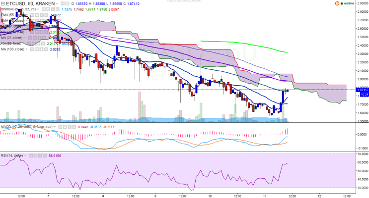 ETC/USD recovered losses on Thursday and has hit 1.88 levels so far in the day (Kraken).