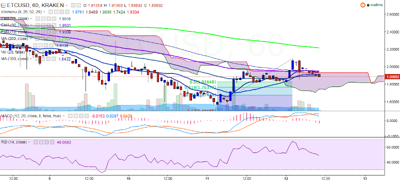 ETC/USD has sharply declined on Friday, falling to 1.83 levels, before hitting a high of 2.09 levels. It currently trades at 1.88 levels at the time of writing (Kraken).