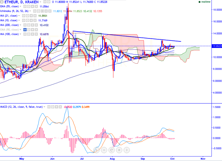 ETH/EUR is seen trading slightly above on Monday. The pair is trading in narrow range between 12.29 and 11.64 for the past three trading sessions (KRAKEN). It is currently trading around 11.869 at the time of writing.