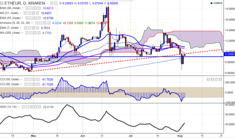 ETH/EUR is seen slightly recovering above on Thursday after the plunge. The pair has recovered after making a low of 6.52 levels (KRAKEN). It is currently trading at 9.55 at the time of writing.