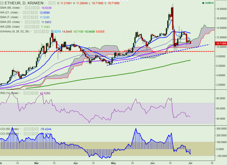 Long term trend is seen to be bullish and short term remains to be bearish. In daily chart ETH/EUR has broken major support 11.62 (55 day EMA). So a decline till 9 is possible.