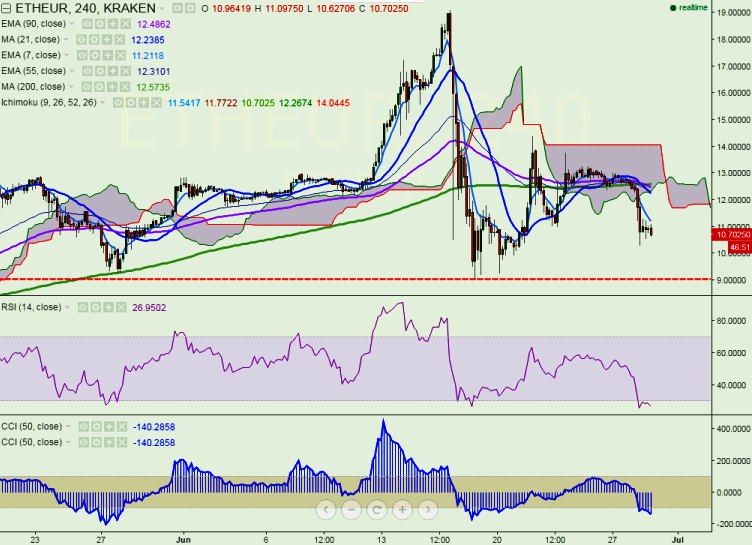 ETH/EUR is seen trading in red on Wednesday. The pair has broken major support 11 (23rd Jun low) and declined till 10.29 levels (KRAKEN). It is currently trading at 10.75 at the time of writing.