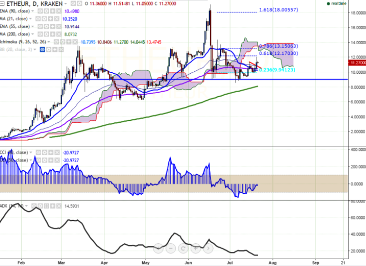 ETH/EUR is seen trading below in red on Thursday. The pair has broken minor resistance 11.40 and jumped till 12.07 levels (KRAKEN) yesterday. It is currently trading at 11.26 at the time of writing.