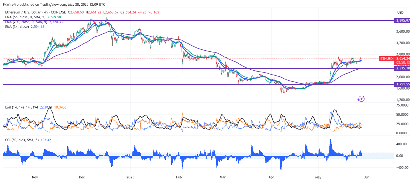 ETHUSD is trading in a narrow range between $2713 and $2463 for the past two days. It hits an intraday high of $2660 and is currently trading around $2656.