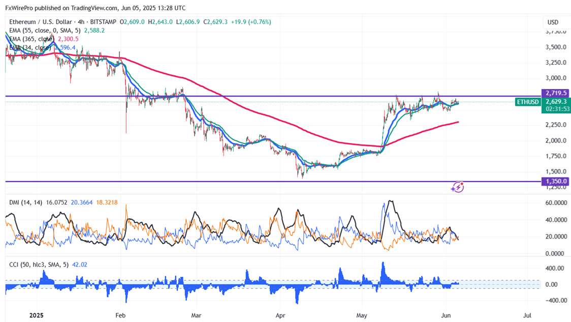 ETHUSD consolidating in a narrow range between $2680 and $2464 for the past three days. It hit a low of $2584 yesterday and is currently trading around $2624.