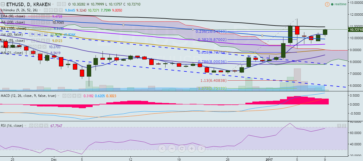 ETH/USD has taken support near 90-EMA and is currently trading at 10.72 levels at press time (Kraken).