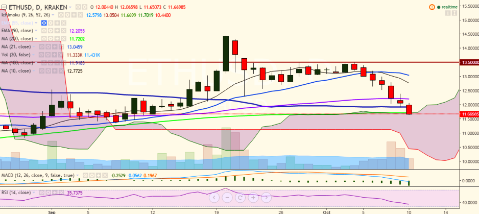 ETH/USD has declined sharply after hitting 13.50 levels and has broken below 200-day MA. It is currently trading at 11.66 levels (Kraken).