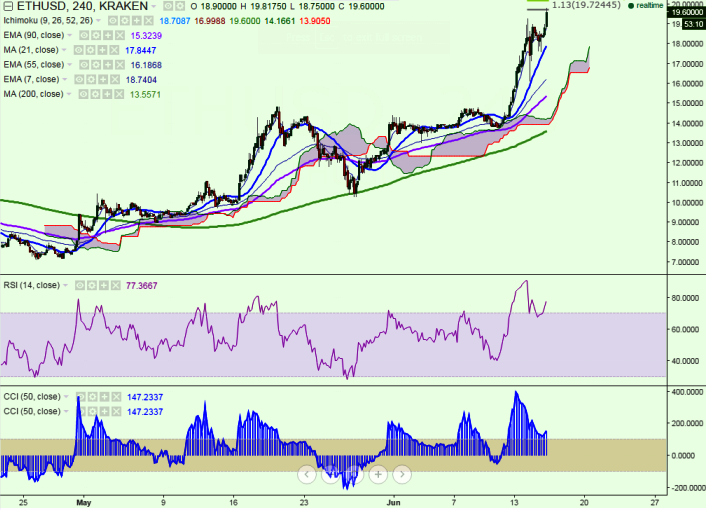 Following a slight dip on Wednesday, ETH/USD is soaring high on a new found momentum. It opened at 18.45 levels on Thursday and hit a new all-time high at 19.81 levels (Kraken). It is currently trading at 19.60 levels at the time of writing.