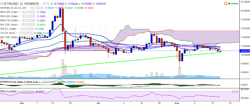 ETH/USD tried to recover its losses on Thursday and hit 11.08 levels so far in the day. However, it failed to hold its strength and currently trades at 10.85 levels at the time of writing (Kraken).