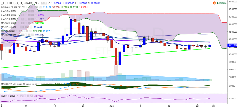 ETH/USD seems to have bounced back after finding support near 200-day MA. The pair is hovering around 21-day MA at 11.28 levels, at the time of writing (Kraken).