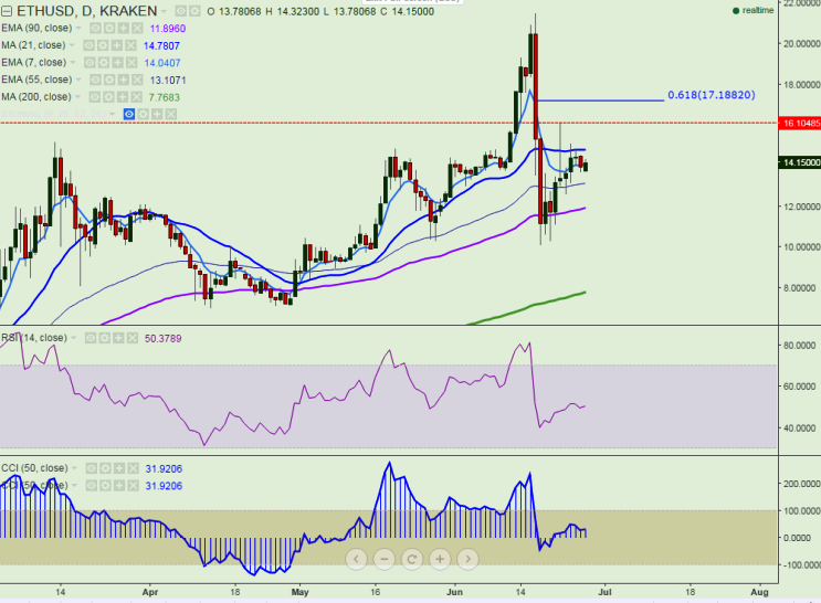 ETH/USD has slightly retreated after making a high of $14.79 (25 Jun high). It is currently trading at $14.15 (Kraken).