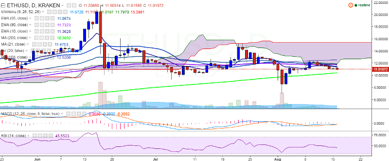 ETH/USD is trading in a narrow range on Tuesday between 11.07 and 11.50 levels. It is currently trading at 11.13 levels (Kraken).