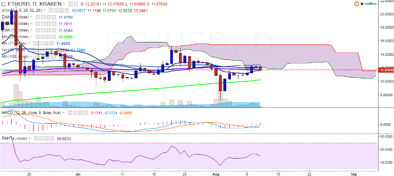 ETH/USD failed to hold its strength above 90 EMA on Thursday and has slipped to 11.65 levels at the time of writing (Kraken).