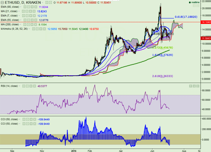 ETH/USD has recovered sharply after making a low of $10.50 at the time of writing. It is currently trading at $11.57 (Kraken).