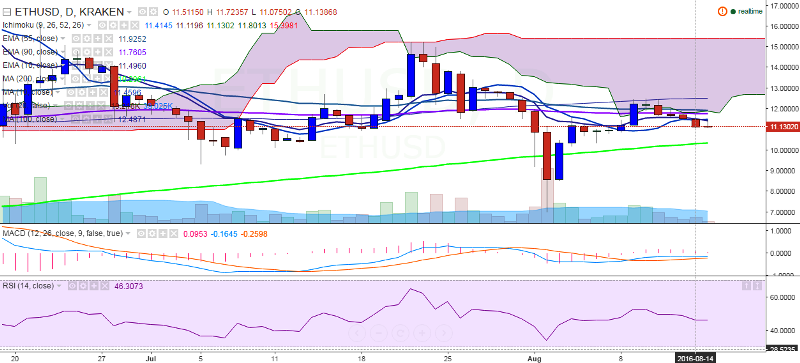 ETH/USD has sharply declined till 11.07 levels, after hitting a high of 12.49 levels on August 10. It is currently trading at 11.20 levels at the time of writing.