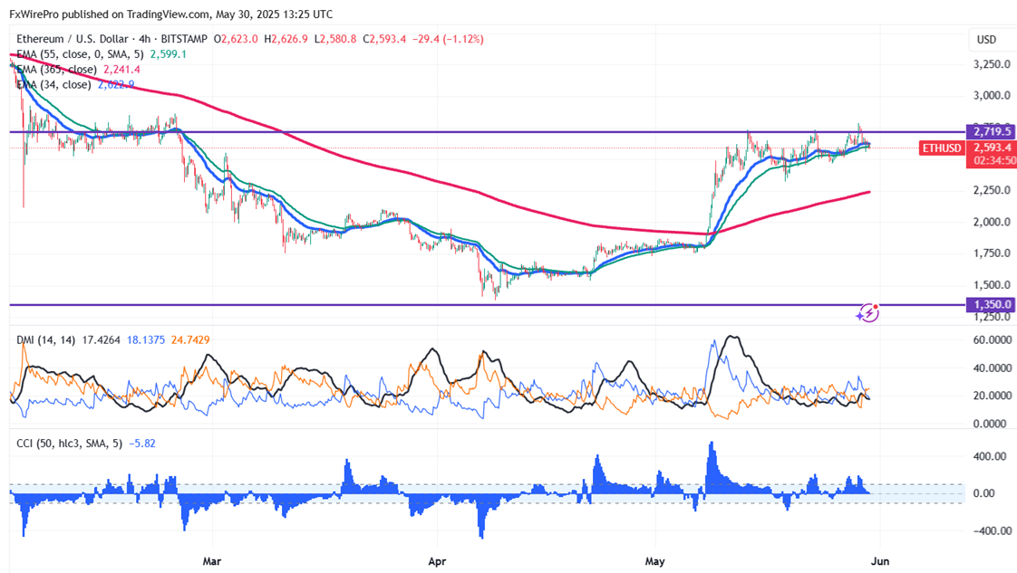 ETHUSD pared some of its gains following the footsteps of Bitcoin. It hit a low of $2559 and is currently trading around $2605.30.