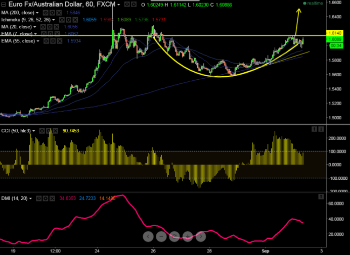 EUR/AUD has made a high of 1.6130 and slightly retreating from that level. It is currently trading at 1.6090 level.