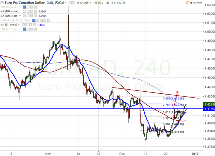 - EUR/CAD has broken major resistance of 1.4170 yesterday and jumped till 1.42177 at the time of writing. It is currently trading around 1.42144.