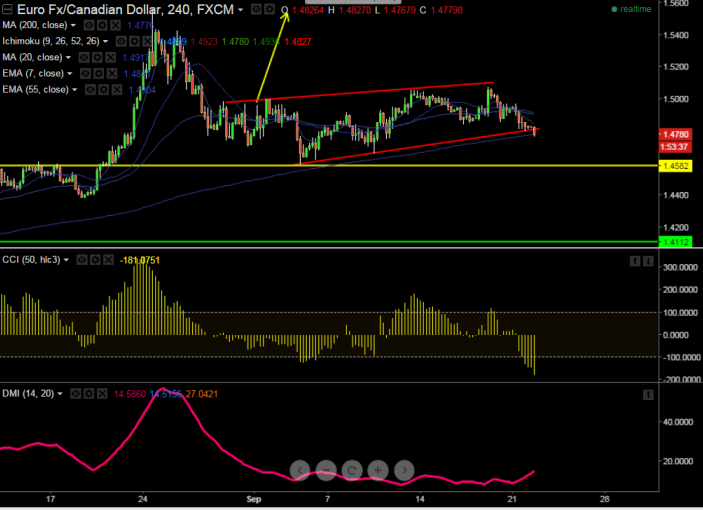 - EUR/CAD breaks short term trend line resistance 1.4800 (trend line joining 1.45955 and 1.4658) and confirms short term weakness, a decline till 1.4600 cannot be ruled out.