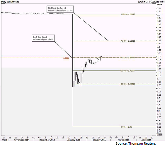 - Gains have cleared initial post-floor-break bounce high at 1.0651 61.8% of the Jan 15 collapse session at 1.0669. 1.0694 highs Tuesday