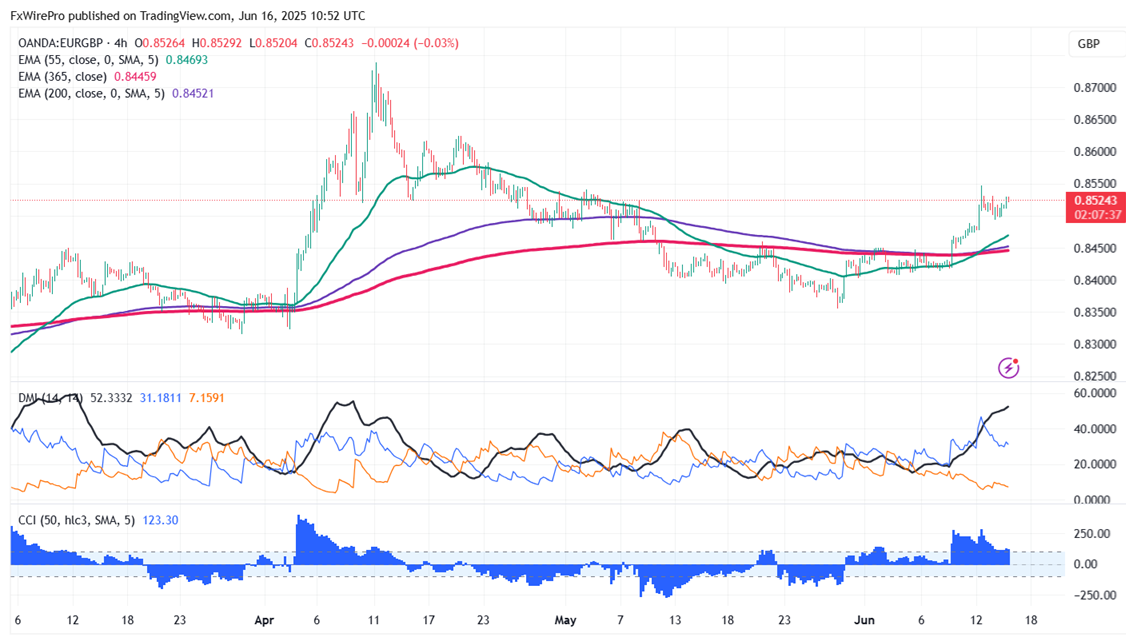 EURGBP holds above 0.8500 on policy divergence between BOE and ECB. Intraday bias remains bullish as long as support 0.8450 holds. It hit an intraday high of 0.85292 and is currently trading around 0.85248.