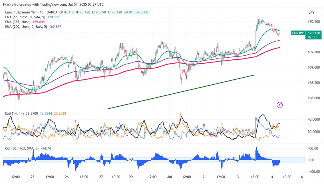 The EUR/JPY pair is trading above 55 EMA, 200, and 365-H EMA on the 4-hour chart.