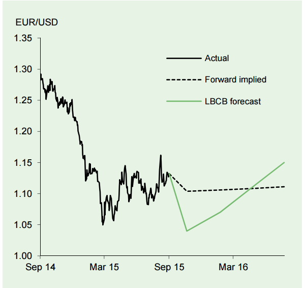 EUR/USD has traded in a wide range over the past month, briefly hitting a sixmonth high above 1.17 in mid-late August following China's currency devaluation. The ramifications of this devaluation, especially on US monetary policy, dominated EUR/USD sentiment. Although the currency pair has since fallen back from its August highs, the FOMC decision to leave its key policy rate unchanged at its 16/17 September policy meeting has put the US dollar back on the defensive. Given the weakness of commodity prices and the euro area's export exposure to China, the ECB has also sounded a dovish note.